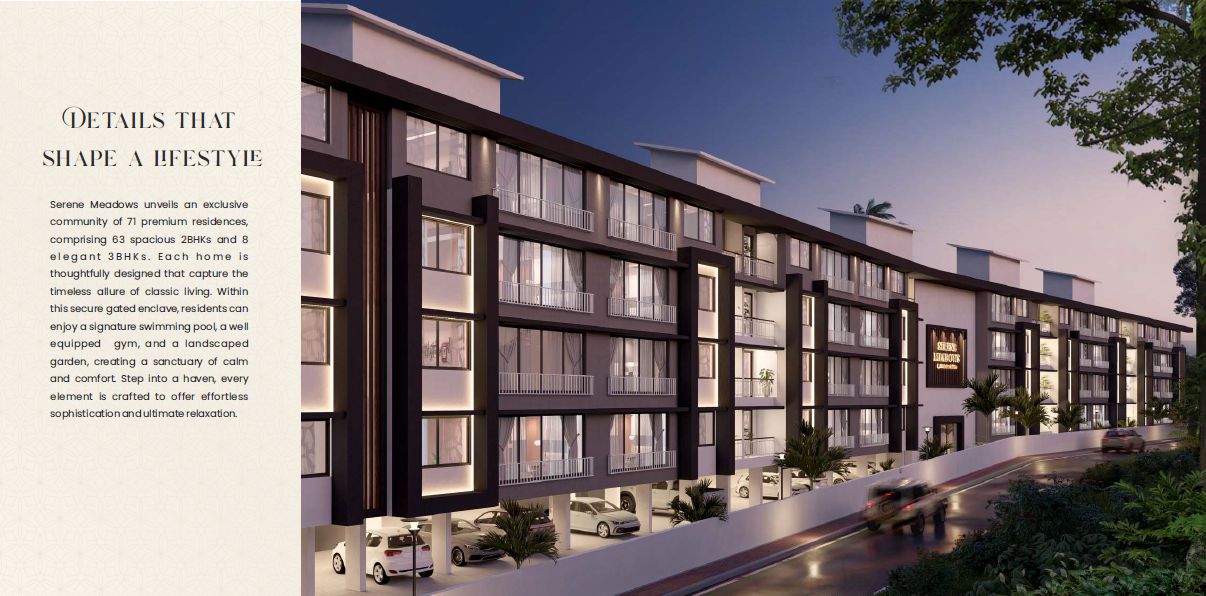 Welcome to Serene Meadows – an exclusive enclave of refined living, where timeless elegance meets modern comfort. This thoughtfully curated community features 71 premium residences , including 63 spacious 2BHKs and 8 elegant 3BHKs , each meticulously designed to reflect the classic charm of enduring architecture.